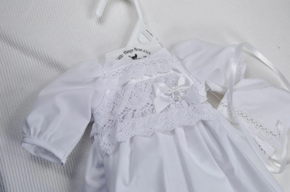 Beautiful batiste gown set with poly-cotton lining and Cluny lace trimmed bodice. This set is ideal for preemie Christenings, bereavement, or porcelain doll clothing. These gorgeous gowns are done to perfection, with great attention to detail and an elegant finish.